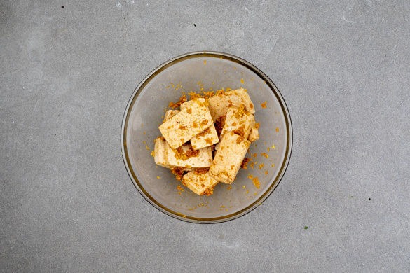 Den Tofu aus der Marinade nehmen und etwas abtropfen lassen. In einer großen Pfanne mit 1EL Pflanzenöl bei mittlerer Hitze 2–3Min. knusprig braun anbraten. Dann wenden und nochmals 2–3Min. von der anderen Seite braten.