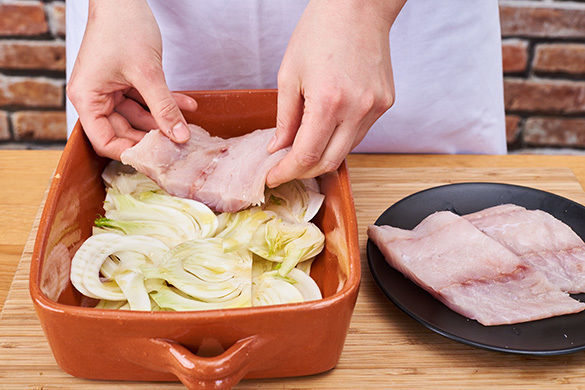 Den Fenchel der Länge nach halbieren, vom Strunk befreien und in möglichst feine Scheiben schneiden. Den Fenchel in einer Auflaufform verteilen, mit 1–2EL Olivenöl sowie Salz und Pfeffer mischen und ca. 10Min. im Ofen vorgaren.