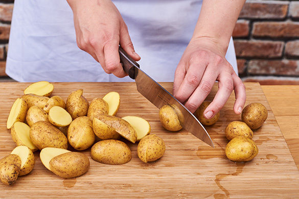 Den Backofen auf 160°C Umluft (180°C Ober-/Unterhitze) vorheizen. In einem mittelgroßen Topf ausreichend gesalzenes Wasser für die Kartoffeln zum Kochen bringen. Die Kartoffeln längs halbieren, dann in das kochende Wasser geben und in 15–20Min. bissfest garen. In ein Sieb abgießen und ausdampfen lassen.
