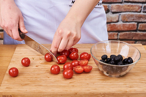 Die Tomaten halbieren. Die Oliven ggf. abtropfen lassen.