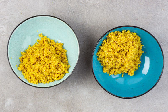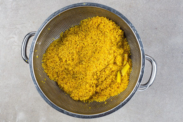 In einem mittelgroßen Topf 800ml gesalzenes Wasser zum Kochen bringen. Den Ingwer vierteln und mit der Quinoa und ca. 1/3 des Kurkumapulvers in das kochende Wasser geben und ca. 8Min. kochen lassen. In ein Sieb abgießen, den Ingwer entfernen und die Quinoa mit Salz und Pfeffer abschmecken. Bis zur weiteren Verwendung warm halten.