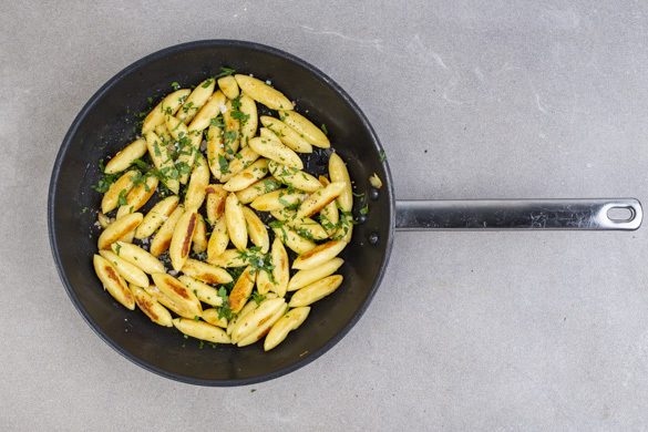 Parallel in einer zweiten Pfanne die Gnocchi mit 2EL Pflanzenöl bei mittlerer Hitze in ca. 5Min. goldbraun und knusprig braten. Die Petersilie unterheben und mit Salz und Pfeffer würzen. Das Sauerkraut nach Wunsch erneut mit Salz und Pfeffer abschmecken und mit den Gnocchi und den Würsten anrichten. Nach Belieben jede Portion mit 1EL Senf servieren.