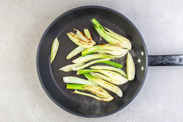 Den Fenchel in einer großen ofenfesten Pfanne mit 1EL Olivenöl und 1 kräftigen Prise Salz bei mittlerer Hitze goldbraun anbraten. Mit dem Zitronensaft ablöschen, aus der Pfanne nehmen und beiseitestellen.