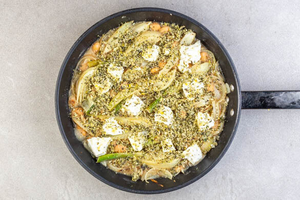 Unsere Bohnen-Fenchel-Pfanne vereint frische Aromen und ausgewogene Texturen zu einem harmonischen Gericht. Weiße Bohnen und fein-würziger Fenchel, mit Zwiebeln, Knoblauch und Thymian verfeinert, bilden die Basis, während geschmolzener Feta und ein knuspriges Kürbiskerntopping für geschmackliche Akzente sorgen. Eine mediterran angehauchte Gaumenfreude, die sowohl im Alltag als auch für Gäste überzeugt.