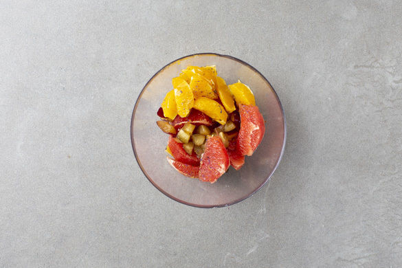 Ca. 1TL Orangenschale abreiben, dann die Orangenschale bis zum Fruchtfleisch rundum abschneiden. Das Fruchtfleisch entweder zwischen den Häutchen in Spalten herausschneiden oder das ganze Fruchtfleisch achteln. Mit der Grapefruit ebenso verfahren. Die Pflaumen halbieren, entsteinen und in ca. 1cm kleine Würfel schneiden.