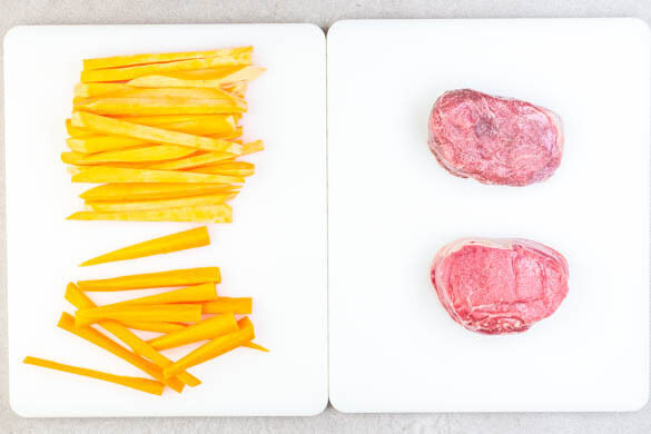 Den Backofen auf 240°C (220°C Umluft) vorheizen. Das Fleisch mit insgesamt 1TL Salz einreiben. Die Süßkartoffeln und die Karotten ggf. schälen und in ca. 1cm breite, pommesartige Stifte schneiden.