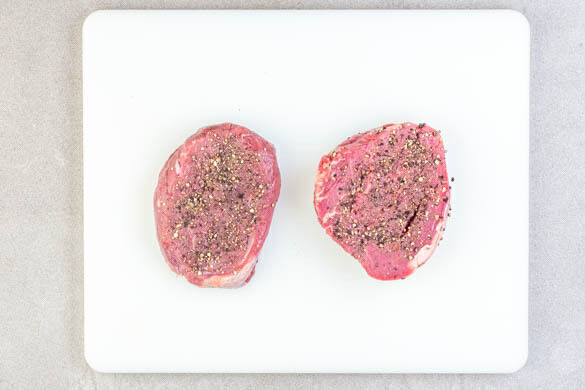 4EL schwarze Pfefferkörner grob mahlen oder zerstoßen und auf einen Teller geben. Das Fleisch trocken tupfen, auf den Pfeffer legen und etwas festdrücken.