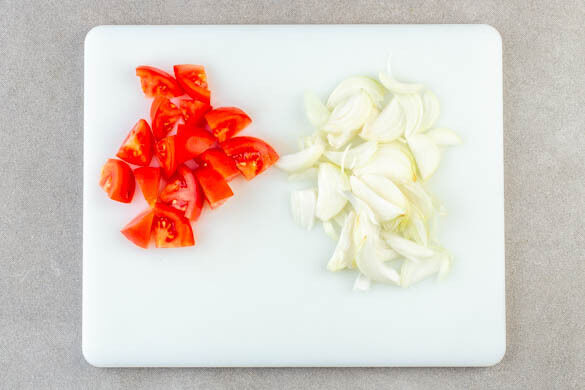 Die Zwiebel schälen, halbieren und in feine Streifen schneiden. Die Tomate vierteln und in 1–2cm große Stücke schneiden. In einem kleinen Topf ausreichend gesalzenes Wasser für die Nudeln aufkochen.