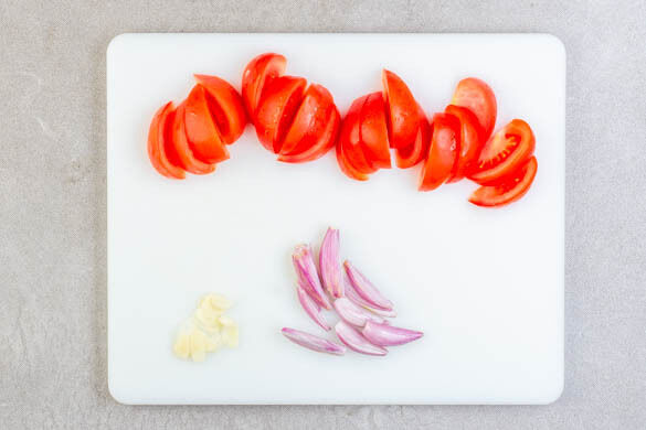 Den Knoblauch schälen und in feine Scheibchen schneiden. Die Schalotte schälen und in ca. 0,5cm breite Spalten schneiden. Die Tomaten in ca. 2cm breite Spalten schneiden.