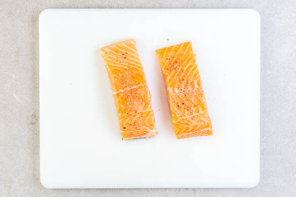 Inzwischen den Fisch mit kaltem Wasser abspülen, trocken tupfen und evtl. vorhandene Gräten und Schuppen entfernen. Dann den Fisch jeweils mit 1TL Olivenöl sowie je 1 Prise Salz und Pfeffer vermengen.