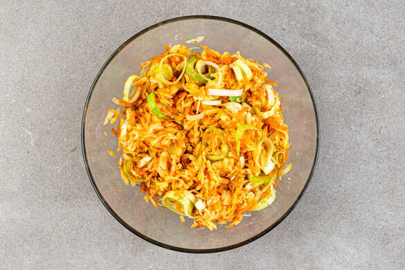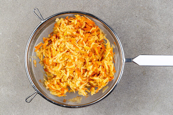 Den Backofen auf 240°C (220ºC Umluft) vorheizen. Die Kartoffeln und die Karotte samt Schale grob raspeln, dann mit ½TL Salz vermengen und ca. 10Min. beiseitestellen. Anschließend mit den Händen so viel Flüssigkeit wie möglich ausdrücken, danach die Gemüseraspel in ein Sieb geben und erneut auspressen.