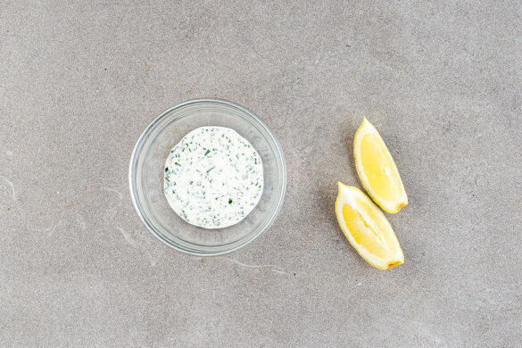 Den Knoblauch schälen und fein reiben. Den Schnittlauch in feine Röllchen schneiden und mit dem Knoblauch, 2EL veganer Mayonnaise und 1EL Wasser verrühren. Den Dip mit Salz und Pfeffer abschmecken. Die Zitrone halbieren, eine Hälfte in 2 Spalten schneiden, die andere Hälfte wird für dieses Rezept nicht benötigt.