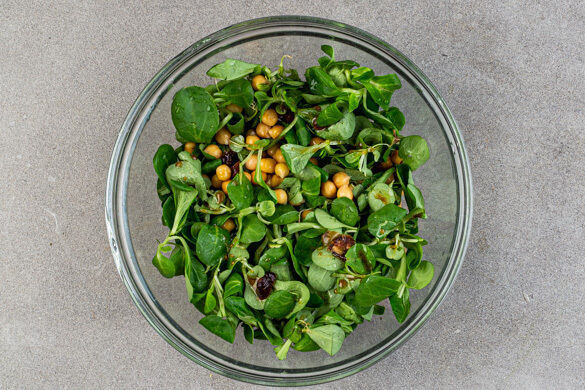 Die Kichererbsen mit den Rosinen und dem Feldsalat vermengen. Den Ahornsirup, 1EL Balsamicoessig, 1TL Senf und je 1 kräftige Prise Salz und Pfeffer verrühren, dann langsam 1EL Olivenöl einrühren, bis ein glattes Dressing entsteht.