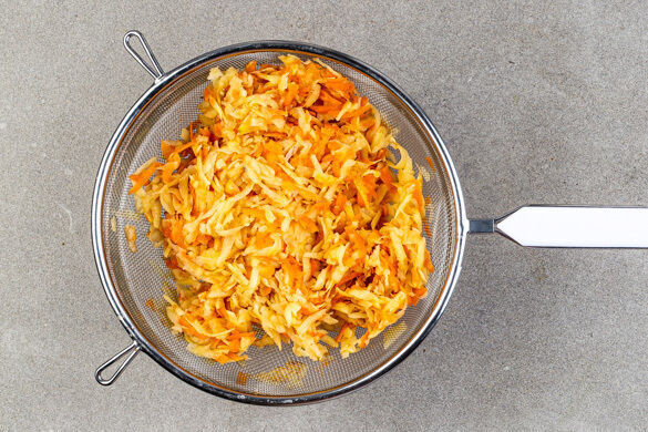 Den Backofen auf 240°C (220ºC Umluft) vorheizen. Die Kartoffeln und die Karotten samt Schale grob raspeln, dann mit 1TL Salz vermengen und ca. 10Min. beiseitestellen. Anschließend mit den Händen soviel Flüssigkeit wie möglich ausdrücken, danach die Gemüseraspel in ein Sieb geben und erneut auspressen.
