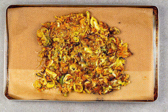 Zwei mit Backpapier ausgelegte Backbleche mit je 1EL Olivenöl bestreichen, dann jeweils die ½ der Gemüsemischung darauf geben. Mit den Händen auf die halbe Größe des Backblechs und ca. 1cm hoch verteilen, dann flach drücken. Die Rösti mit je 1EL Olivenöl beträufeln und im Ofen 20–25Min. backen, bis die Ränder goldbraun sind. Die Position der Bleche nach der Hälfte der Zeit tauschen.