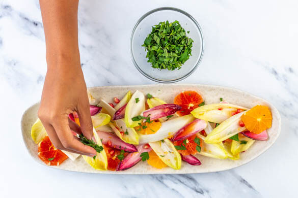 Ein aufregender Wintersalat mit würzigem Chicorée, mariniert in einem feinen Ahorn-Orangen-Dressing. Serviert mit Orangen- und Blutorangenscheiben, spritzigen Granatapfelkernen sowie frischer Minze und Petersilie. Ein farbenfrohes Highlight auf jeder festlichen Tafel und ideal als erfrischende Vorspeise oder raffinierte Beilage zu den Feiertagen
