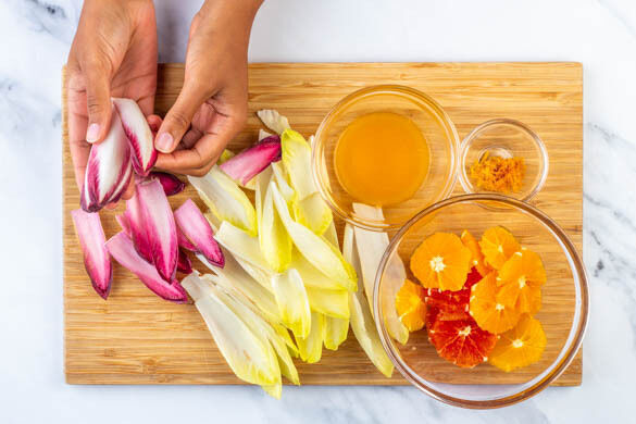 Die ½ der Orangenschale fein abreiben, dann die Orange halbieren und eine Hälfte auspressen. Die andere Orangenhälfte und die Blutorangen schälen, dabei auch die weiße Haut entfernen. Das Fruchtfleisch in dünne Scheiben schneiden. Den Chicorée in einzelne Blätter zerteilen.