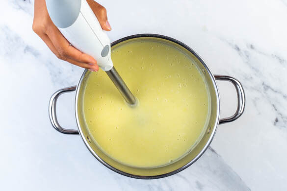 Den Lauch in einem mittelgroßen Topf mit 1EL Butter und 1 Prise Salz bei mittlerer Hitze in 1–2Min. glasig anbraten. 600ml Wasser angießen. Sobald das Wasser heiß ist, die ½ des Brühgewürzes zugeben und auflösen. Die Kartoffeln dazugeben und einmal aufkochen, dann die Hitze reduzieren und alles abgedeckt bei mittlerer Hitze ca. 20Min. köcheln lassen, bis die Kartoffeln weich sind.