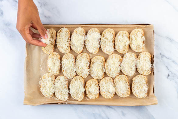 Den Backofen mit Grillfunktion oder Ober-/Unterhitze auf 250°C vorheizen. Das Brötchen in ca. 1cm breite Scheiben schneiden und auf ein mit Backpapier ausgelegtes Backblech legen. Im vorgeheizten Backofen in ca. 2Min. goldbraun rösten. Die Crostini wenden, mit dem Käse bestreuen und weitere 2Min. rösten, bis der Käse geschmolzen ist, dann aus dem Ofen nehmen.