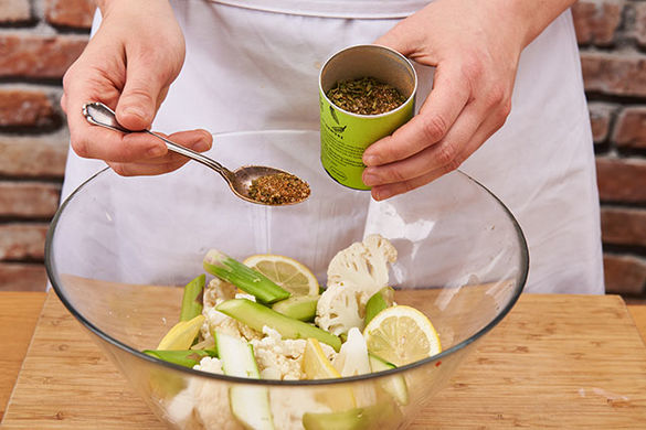 Den Blumenkohl, den Spargel ohne die Spitzen mit den Zitronenscheiben in eine Schüssel geben, mit 1TL Zitronenabrieb, 1-2EL Olivenöl sowie dem Kartoffelsalatgewürz sowie etwas Salz und Pfeffer marinieren.