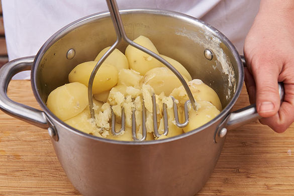 Backofen auf 220°C Ober- und Unterhitze vorheizen. Einen mittelgroßen Topf mit ausreichend gesalzenem Wasser zum Kochen bringen. Die Kartoffeln schälen und vierteln. Im kochenden Wasser ca. 10-15Min. weich kochen und schließlich abgießen.