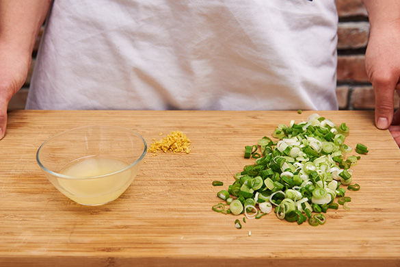 Inzwischen die Lauchzwiebeln in schräge, feine Ringe schneiden. Die Schale der Zitronen abreiben und den Saft auspressen.