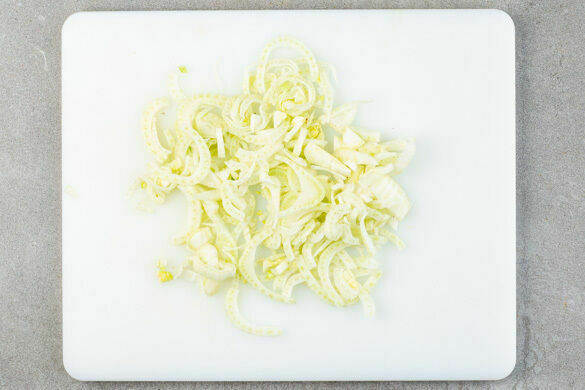In einem mittelgroßen Topf 800ml leicht gesalzenes Wasser für die Quinoa zum Kochen bringen. Den Fenchel längs halbieren und in dünne Streifen schneiden, dabei die Stiele entfernen.