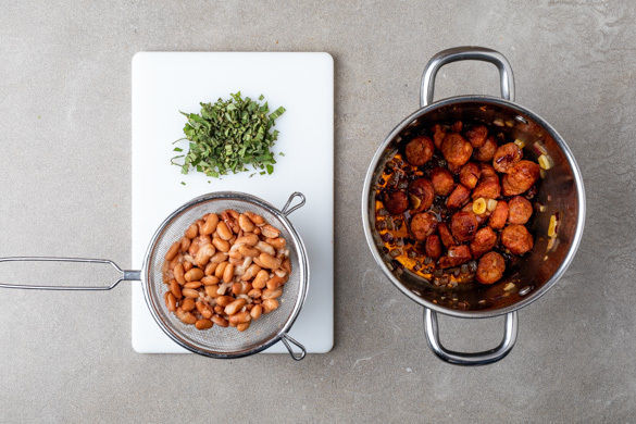 Die Paprika, die Bohnen und die gehackten Tomaten sowie 75ml Wasser (oder nach Geschmack auch Weißwein) in den Topf geben und das Brühgewürz unterrühren. Die Temperatur reduzieren, den Salbei unterrühren und den Eintopf 12–15Min. sanft köcheln lassen, bis die Paprika und die Bohnen gar sind. Dabei gelegentlich umrühren.