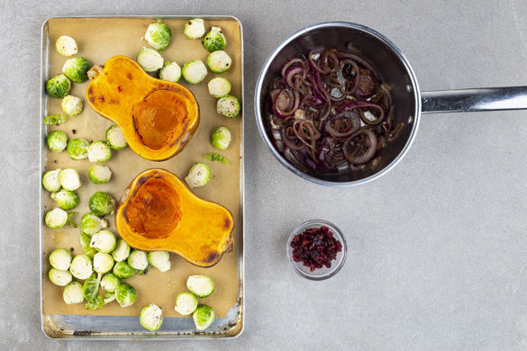 Den Rosenkohl mit der Gewürzmischung, 1TL Olivenöl sowie je 1 Prise Salz und Pfeffer vermengen und während der letzten ca. 8Min. der Garzeit zum Kürbis auf das Blech geben und mitbacken. Die Zwiebeln in einem kleinen Topf bei mittlerer Hitze mit 1EL Olivenöl und je 1TL Salz und Zucker 3–5Min. karamellisieren. Die Cranberrys in ein Sieb abgießen.