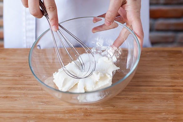 Frischkäse in eine Schüssel geben und mit 2EL Zucker verrühren, dafür am besten einen Schneebesen oder eine Gabel verwenden. Wer es süßer will, einfach etwas mehr Zucker untermengen.