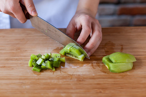 Kiwi schälen und in kleine Würfel schneiden.