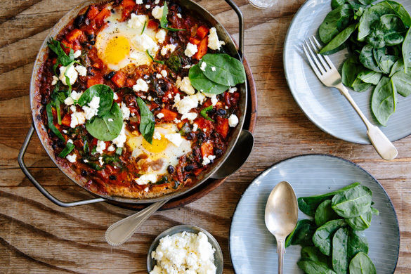 Die Shakshuka am besten in der Pfanne mit dem restlichen Spinat garnieren und servieren.