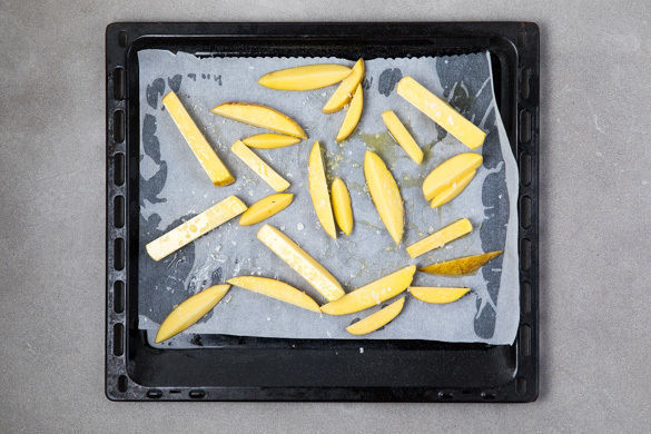 Die Kartoffeln samt Schale in ca. 1cm dicke Scheiben und diese in ca. 1cm dicke, pommesartige Stifte schneiden. Auf einem mit Backpapier ausgelegten Backblech mit 1–2EL Olivenöl und etwas Salz vermengen, gleichmäßig verteilen und 10–15Min. im Ofen backen, bis die Pommes goldbraun und knusprig sind. Zwischendurch einmal wenden.