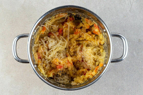 Das Sauerkraut in einem Sieb abspülen. Mit den Tomaten zum Gemüse in den Topf geben und das Gemüse noch 5–10Min. garen, bis die Kartoffeln gar sind. Das Gemüse zu einem groben Püree stampfen und mit Salz und Pfeffer abschmecken. Die Drumsticks auf dem Kartoffel-Sauerkraut-Stampf anrichten, mit der restlichen gewürfelten Peperoni garnieren und servieren.