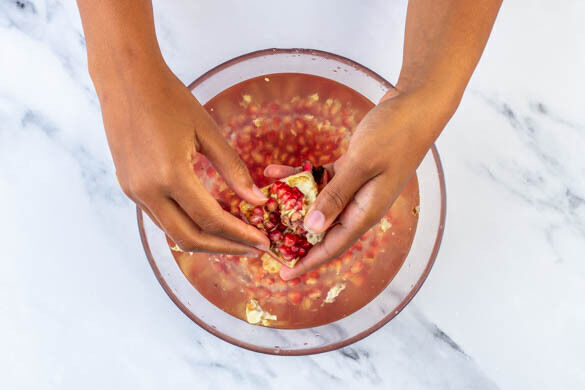 Den Granatapfel halbieren und in eine Schüssel mit Wasser geben. Die Granatapfelkerne vorsichtig herauslösen, dabei die weiße Haut entfernen. Die Granatapfelkerne in ein Sieb abgießen.