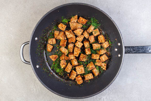 In der Pfanne 1½EL Butter schmelzen lassen. Die Brötchenwürfel darin bei mittlerer Hitze 4–5Min. knusprig anrösten und mit Salz und Pfeffer würzen. Den Dill untermengen und die Croûtons auf dem fertigen Auflauf verteilen. Den Salat mit dem Dressing vermengen und zum Kartoffelauflauf servieren.