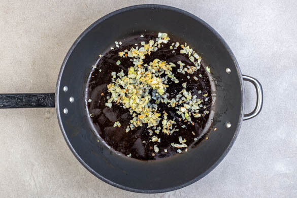 Den Backofen auf 220°C (200°C Umluft) vorheizen. Die Zwiebel schälen, halbieren und fein würfeln, dann in einer mittelgroßen Pfanne mit 1EL Olivenöl und 1 Prise Salz bei mittlerer Hitze in 3–5Min. glasig braten, dabei gelegentlich umrühren. Die Pfanne vom Herd nehmen und abkühlen lassen.