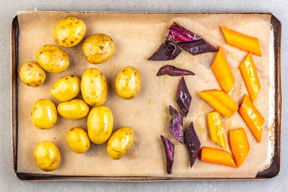 Die Karotten ggf. schälen, längs halbieren und schräg vierteln, dann auf einem mit Backpapier ausgelegten Backblech mit 1EL Olivenöl und je 1 kräftigen Prise Salz und Pfeffer vermengen. Die Kartoffeln daneben mit 1EL Olivenöl und je 1 kräftigen Prise Salz und Pfeffer vermengen. Das Gemüse im Ofen 15–20Min. rösten.
