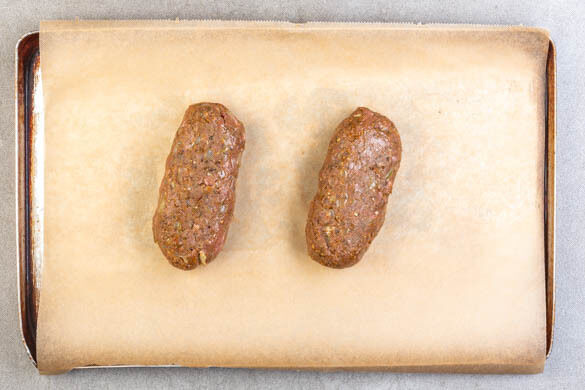 Währenddessen das Hackfleisch mit der ½ der Semmelbrösel, den Zwiebeln, der Gewürzmischung, 1EL Ketchup und 1 Eigelb (das Eiweiß kann für ein anderes Rezept verwendet werden) verkneten. Aus der Hackmasse insgesamt 2 kleine Laibe formen und auf ein zweites mit Backpapier ausgelegtes Backblech legen.