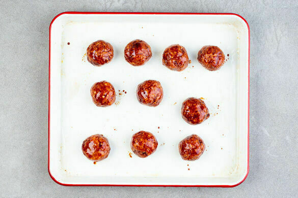 Das Hackfleisch mit der Sriracha-Sauce, der ½ der Teriyakisauce und ½TL Salz verkneten. Zu walnussgroßen Kugeln formen, mit reichlich Abstand in eine Auflaufform setzen und mit der restlichen Teriyakisauce bestreichen.