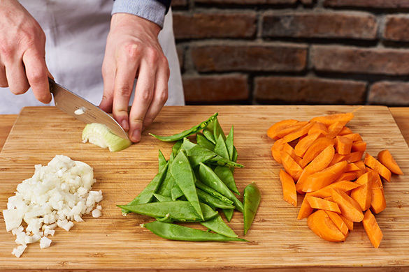 Die Karotten schälen, der Länge nach halbieren und schräg in ca. 1cm breite Scheiben schneiden. Die Enden der Kaiserschoten abschneiden und die Kaiserschoten diagonal halbieren. Die Zwiebeln schälen, halbieren und in feine Würfel schneiden. Die Limette halbieren und auspressen.