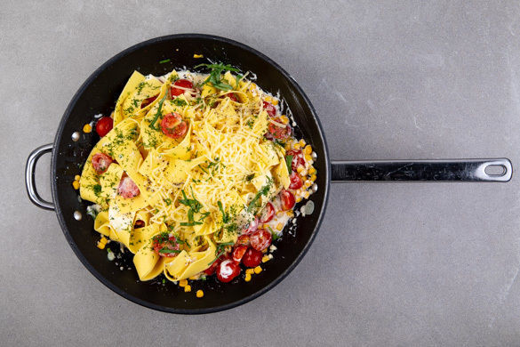 Für dieses feine Pastagericht schneidest du frische Lasagneblätter in breite Fettuccine und garst sie wie gewohnt in kochendem Salzwasser. Sie sind die perfekte Ergänzung zur cremig-käsigen Sauce mit Mais und fruchtigen Kirschtomaten, frischem Dill und Basilikum. Geröstete Kürbiskerne sorgen für leckeren Crunch. Guten Appetit!