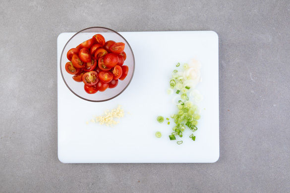 Die Tomaten halbieren. Die Lauchzwiebeln in feine Ringe schneiden. Den Knoblauch schälen und fein würfeln.