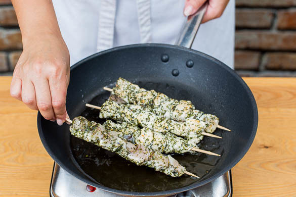 Die Fleischstücke dicht aneinander auf 8 Schaschlikspieße ziehen und diese in einer großen Pfanne bei mittlerer Hitze rundum anbraten, bis das Fleisch goldbraun und gar ist. Den Feta mit den Fingern über den Pommes zerkrümeln. Die Feta-Pommes mit den Souvlaki und dem Gurkensalat anrichten und mit dem Dip servieren.