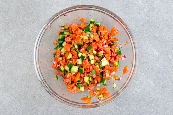 Die Haut entfernen und den Lachs in kleine Würfel schneiden, evtl. vorhandene Gräten mit einer Pinzette entfernen. Den Lachs mit den Gurkenwürfeln, den Zwiebeln, dem Limettensaft und -abrieb und der Sweet-Chili-Sauce vermengen. Mit Salz und Pfeffer sowie ggf. etwas Essig abschmecken und kühl beiseitestellen.