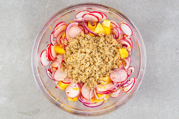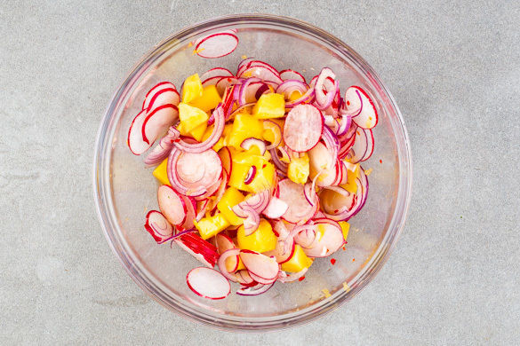 Die Mangos schälen und das Fruchtfleisch möglich dicht am Stein abschneiden. Das Mangofruchtfleisch in 1–2cm große Würfel schneiden. Die Radieschen in dünne Scheiben schneiden. Die Mangowürfel samt ausgetreteten Säften mit den Radieschen und dem Dressing vermengen.