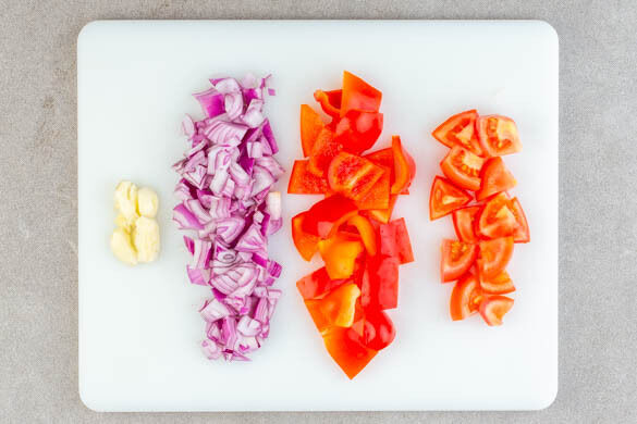 Die Zwiebeln schälen, halbieren und grob würfeln. Den Knoblauch mit der flachen Seite eines Messers zerdrücken und die Schale entfernen. Die Paprika vierteln, entkernen und grob in ca. 2cm große Stücke schneiden. Die Tomaten grob würfeln.