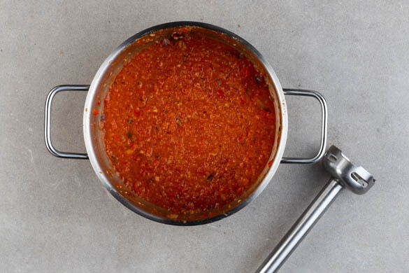 Das Gemüse kräftig mit Salz und Pfeffer würzen und 8–10Min. köcheln lassen, bis das Gemüse gar und ein Großteil der Flüssigkeit verdampft ist. Den Käse in den Topf geben und alles mit einem Stabmixer pürieren, bis eine sämige Sauce entsteht. Erneut mit Salz und Pfeffer abschmecken.