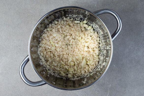 Die Zwiebeln in einem großen Topf mit 2EL Olivenöl bei mittlerer Hitze ca. 1Min. glasig anschwitzen. Den Reis hinzufügen und ca. 1Min. anrösten.