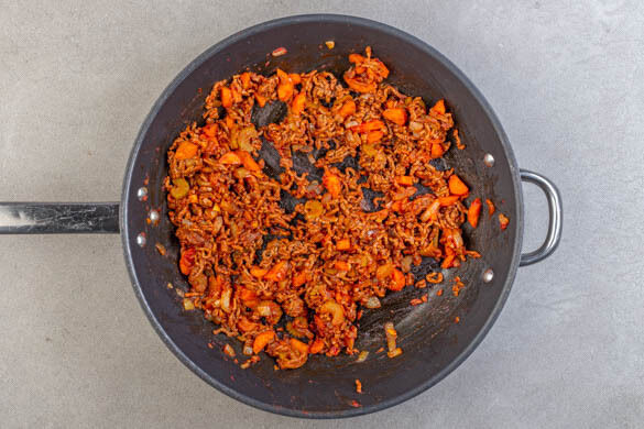 Den Knoblauch und das Tomatenmark in die Pfanne geben und ca. 2Min. mitbraten, dann das Hackfleisch und 1 kräftige Prise Zucker zugeben und in weiteren 5–8Min. braun braten, dabei das Hackfleisch mit einem Pfannenwender in kleinere Stücke zerteilen.